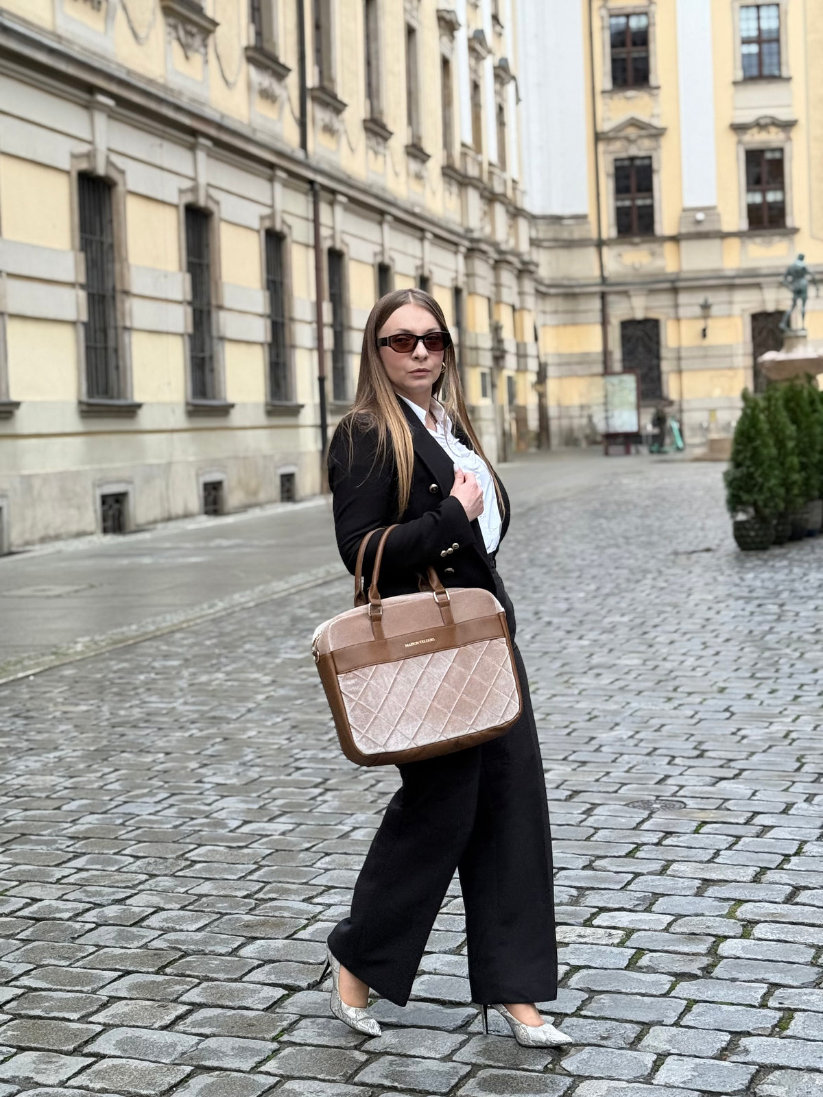 This is my very first design, created out of a need I felt myself and one I knew so many other women shared. A bag that reflects our ambition: feminine, structured, and practical without compromise. Spacious enough for a 16″ laptop, books, and a water bottle. Lightweight at only 1 kg. Finished with a water-repellent interior to protect what matters most.